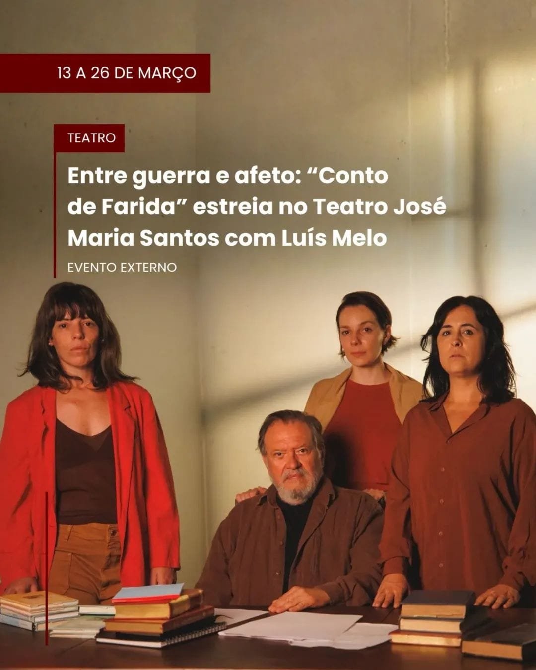 No dia 13 de março, o Teatro José Maria Santos recebe a estreia nacional de “Conto de Farida”, com dramaturgia de Luci Collin e direção de Eduardo Ramos. O espetáculo marca o retorno de Luís Melo aos palcos paranaenses e aborda os impactos da guerra e do exílio a partir da história de uma família síria dilacerada pelo conflito. A temporada é gratuita e inclui sessões com acessibilidade.